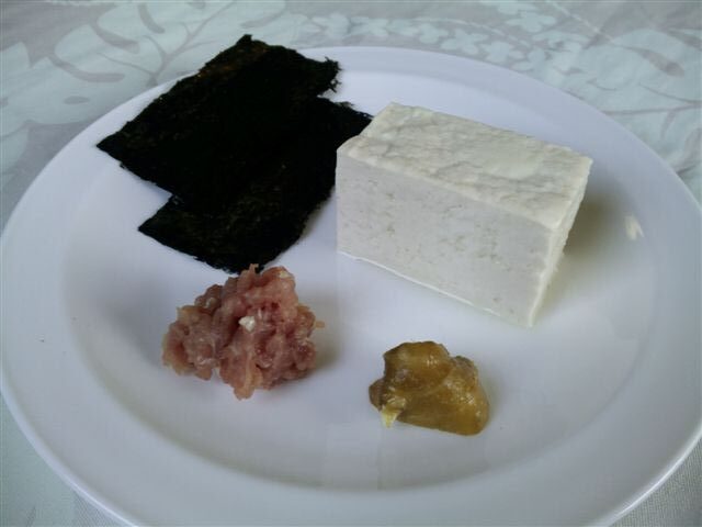 豆腐は、キッチンペーパーにくるみ、重しをして30分ほど置く。