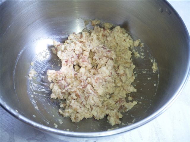 豆腐と豚ひき肉、調味料をあわせて、しっかりとまぜる。