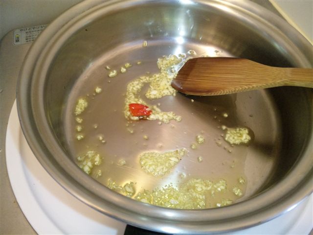 鍋にオリーブオイルと、にんにく・とうがらし、を入れて火にかける。