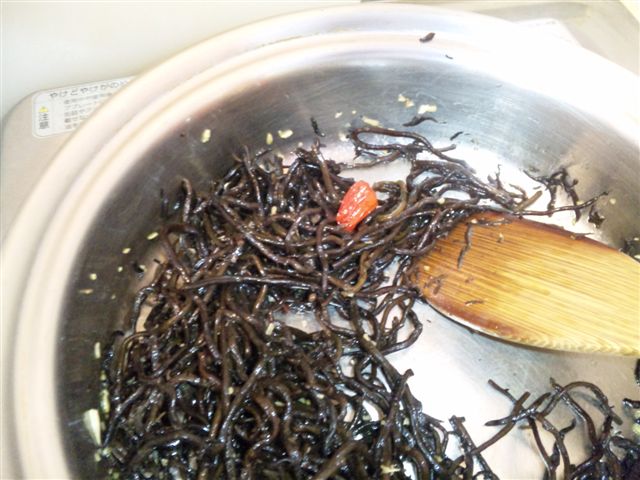 香りがでてきたら、ひじきを入れて、塩・こしょうで味をととのえて出来上がり。