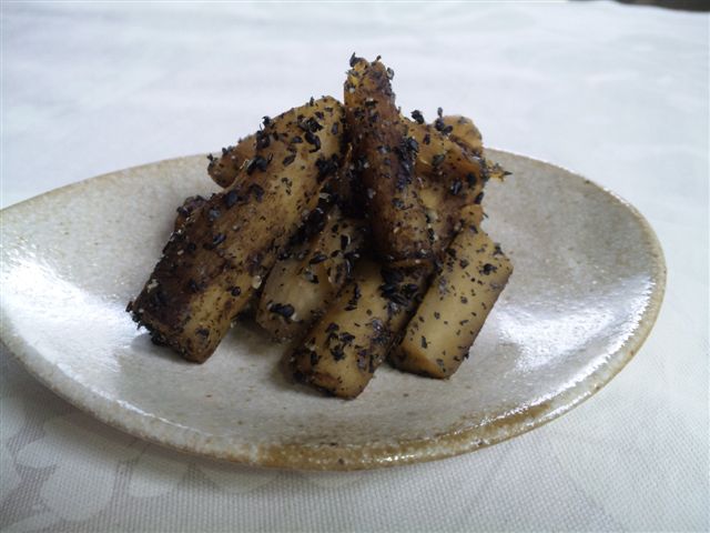 鍋にごぼうとひたひたのだし汁を入れて火にかけ、やわらかくなったら、みりん、しょうゆを入れて煮汁がなくなるまで煮る。