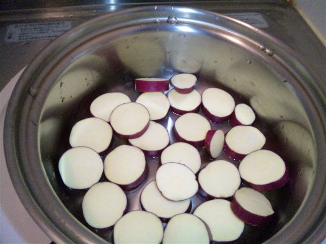 鍋にさつまいもを入れて、ひたひたの水から煮たてる。