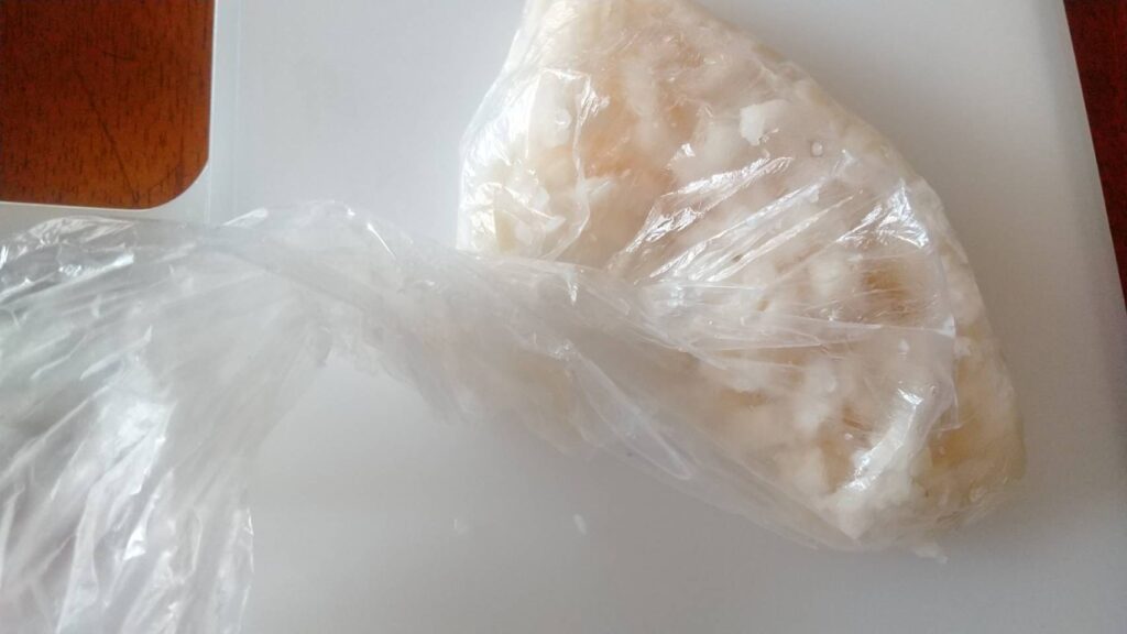 れんこんは皮をむき、一口大に切ってビニール袋に入れる。すりこ木(ビン)などを使って、全体が細かくなるまでたたく。